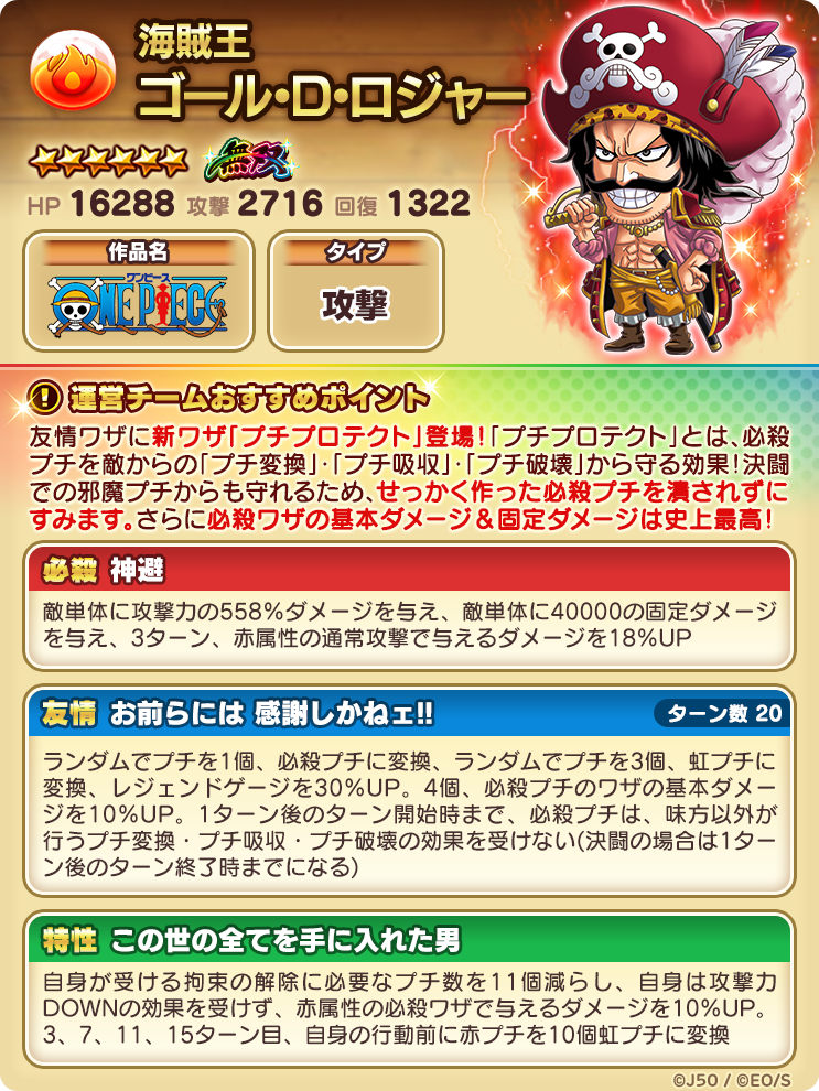 新ワザ「プチプロテクト」が登場!プチプロテクトは特定のプチを一定ターン、敵の「プチ変換」「プチ吸収」「プチ破壊」効果から守るワザで、当キャラの場合は必殺プチを守ることができます!「せっかく作った必殺プチをここぞと言う時のために温存しておきたい!」「邪魔プチに消されたくない...!」という時に輝くワザですので、ぜひGETして体験してみてください。また、必殺ワザは基本ダメージが558%と全キャラトップの数値!とてつもない火力を誇るキャラなので、メインの使用もおすすめです。