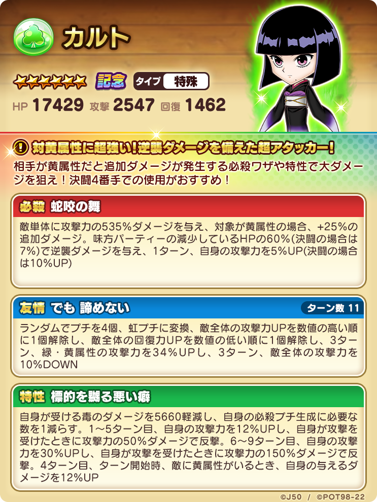 対黄属性に対して超強力なアタッカー!冒険ではもちろん、決闘4番手にオススメ!味方パーティーの減少しているHPに応じて逆襲ダメージ!