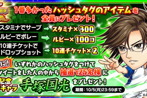 ハッシュタグ投稿で参加するとプチ友全員に豪華報酬と抽選で新記念★5キャラ「手塚国光」が当たるキャンペーン開催!