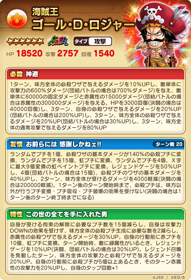 ▼キャラクターアイコンを押して詳細切替必殺ワザは、620%+55000の強力な固定ダメージに加えてレジェンドゲージもUP!さらに味方の攻撃力UPや回復力UP、必殺ワザで与えるダメージUPなどの効果を1ターン延長できるぞ!友情ワザは、強力な必殺プチ変換に加えてレジェンジゲージを100%UP!すぐにレジェンドが使えるぞ!