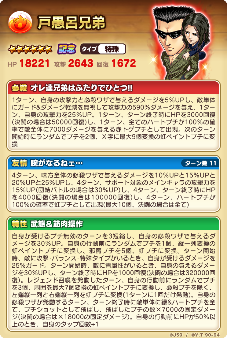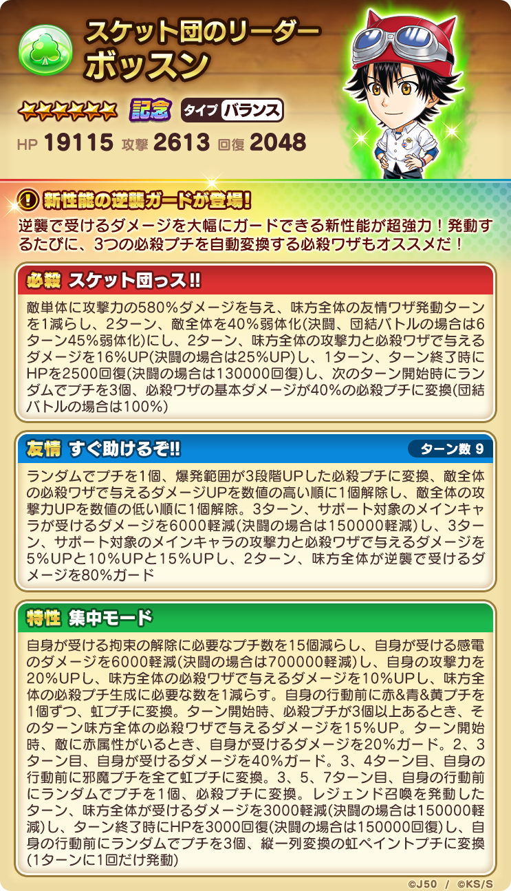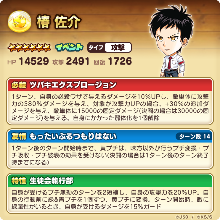 2023年11月19日|キャラ性能 新キャラ性能大公開!!ジャンプチ ヒーローズ 大特集祭 SKET DANCE編 *もくじ スケット団のリーダー ボッスン 早乙女 浪漫 安形 紗綾 椿 佐介 安形 惣司郎 吉備津 百香 戸愚呂兄弟 全霊の拳 ラオウ 鬼舞辻無惨 カイドウ ▼キャラクターアイコンを押して詳細切替 ※表示の数値は最大強化時のものです。 ▼キャラクターアイコンを押して詳細切替 ※表示の数値は最大強化時のものです。 上方修正・キャラパネル開放キャラ ▼キャラクターアイコンを押して詳細切替 ※表示の数値は最大強化時のものです。ジャンプチ ヒーローズ運営チーム